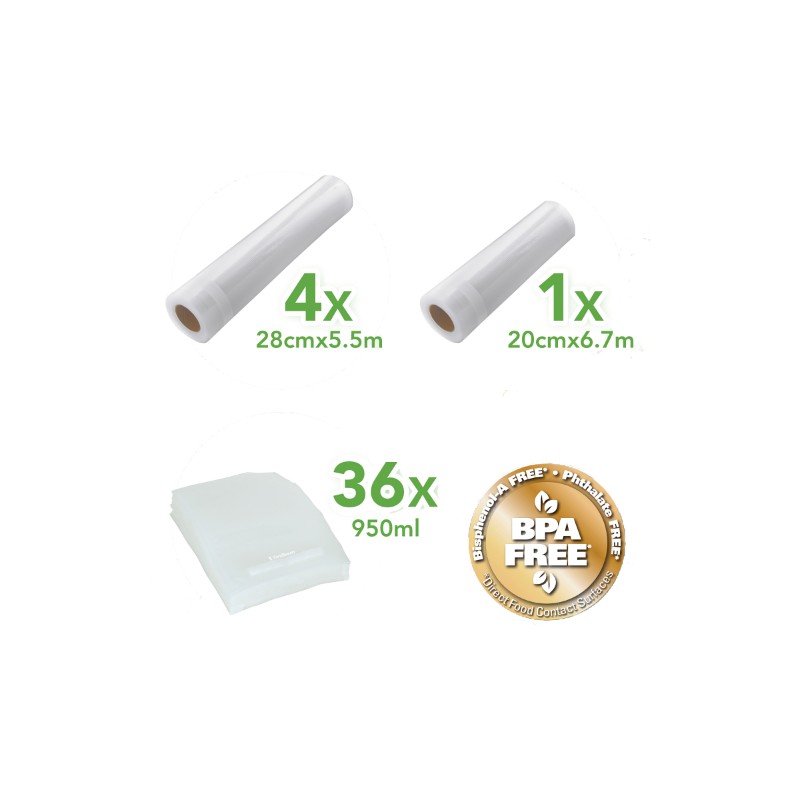 Uniwersalny zestaw do pakowania próżniowego – 36 torebek 950 ml + 5 rolek folii (4 × 28 cm × 5,5 m + 1 × 20 cm × 6,7 m). Moletowane, bez BPA, idealnie pasują do urządzeń FoodSaver.