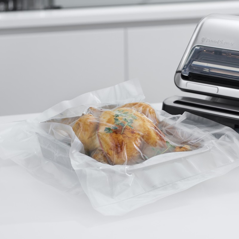 Torebki i folie FoodSaver są wolne od BPA, wystarczająco mocne, by bezpiecznie używać ich w kuchence mikrofalowej. Są trwałe, a jednocześnie giętkie i tworzą doskonałą hermetyczną barierę wokół żywności. Wszystkie posiadają wyraźną strukturę moletowaną (przetłoczenia po jednej stronie), która zapewnia sprawne odprowadzenie powietrza podczas pakowania próżniowego. Wykonane są w wielowarstwowej technologii – warstwa poliamidu (PA) działa jako skuteczna bariera dla tlenu, a warstwa liniowego polietylenu niskiej gęstości (LLDPE) stanowi doskonałą barierę dla pary wodnej, dzięki czemu zarówno gotowe torebki, jak i folie z rolki gwarantują długotrwałą świeżość przechowywanej żywności.