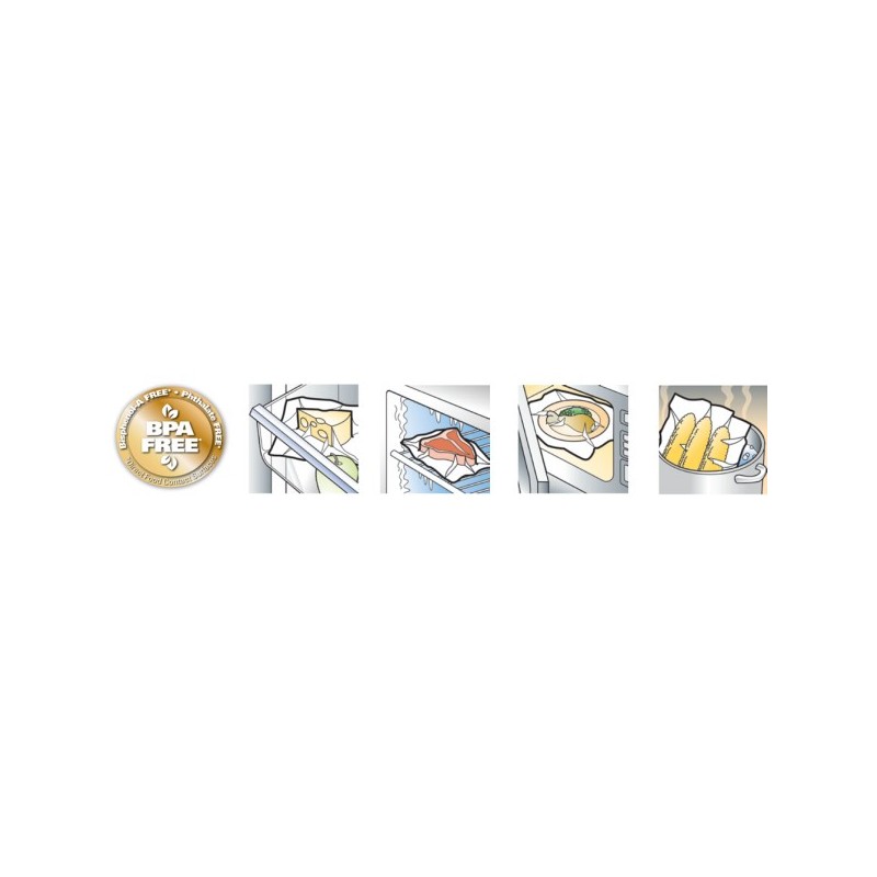 Wolne od BPA worki są wystarczająco mocne, by można było używać ich w kuchence mikrofalowej lub do gotowania. Są trwałe, a jednocześnie giętkie i tworzą hermetyczną barierę wokół żywności. Worki i folie moletowane FoodSaver posiadają wyraźną strukturę po jednej ze stron. Przetłoczenia na folii mają na celu sprawne odprowadzenie powietrza podczas pakowania próżniowego. Worki i folie moletowane FoodSaver posiadają wielowarstwową konstrukcję z PA używanego jako bariera dla tlenu i polietylenu (LLDPE) używanego jako bariera dla pary wodnej.