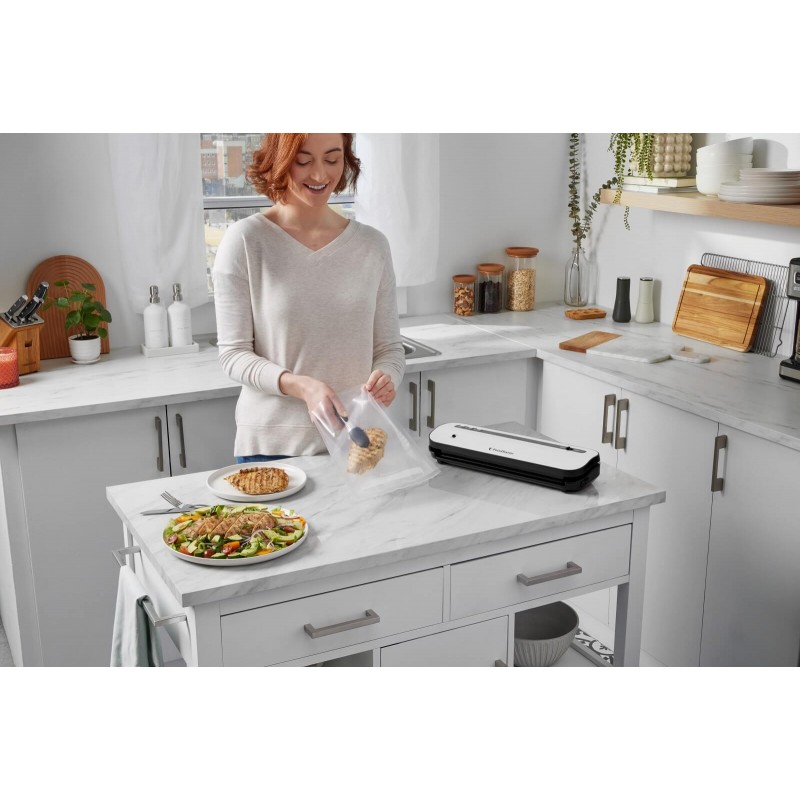 ✔ O 50% większa oszczędność miejsca**: Dzięki niewielkim rozmiarom (45 x 24 x 12 cm), oszczędzająca miejsce konstrukcja jest idealna do mniejszych kuchni, zapewniając jednocześnie pełną wydajność i jest kompatybilna ze wszystkimi workami i bębnami FoodSaver.